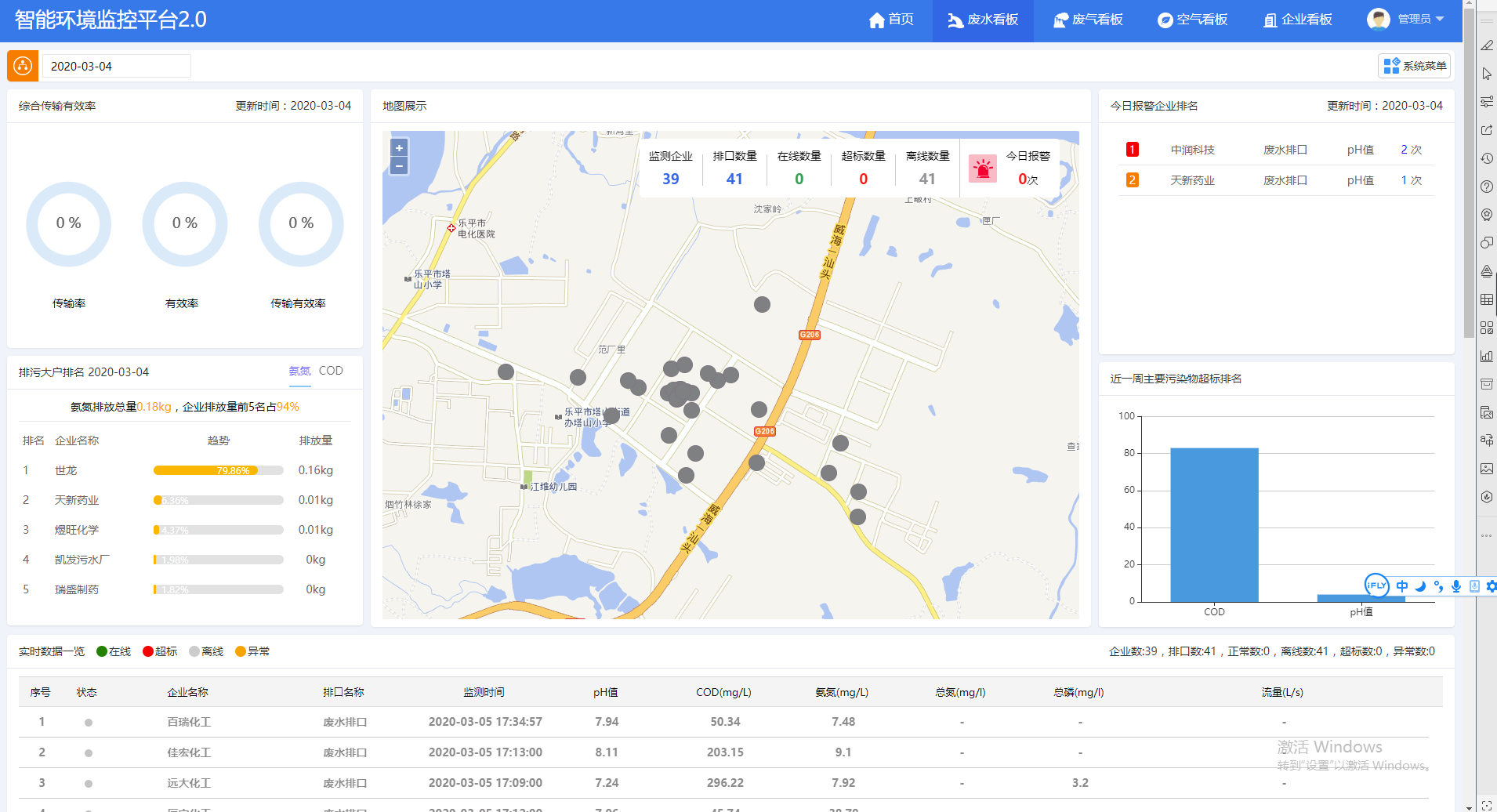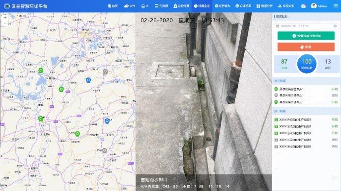 Panoramic display: Various environmental data are combined with location data to display the distribution of monitoring points, sewage discharge units, and alarm information in the form of a map.