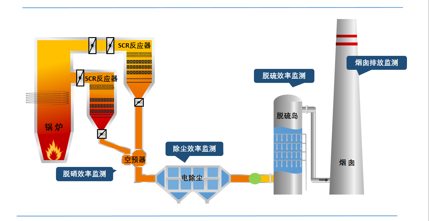 火電廠全工藝鏈監(jiān)測,如脫硝效率、除塵效率、脫硫效率、超低排放等監(jiān)測。